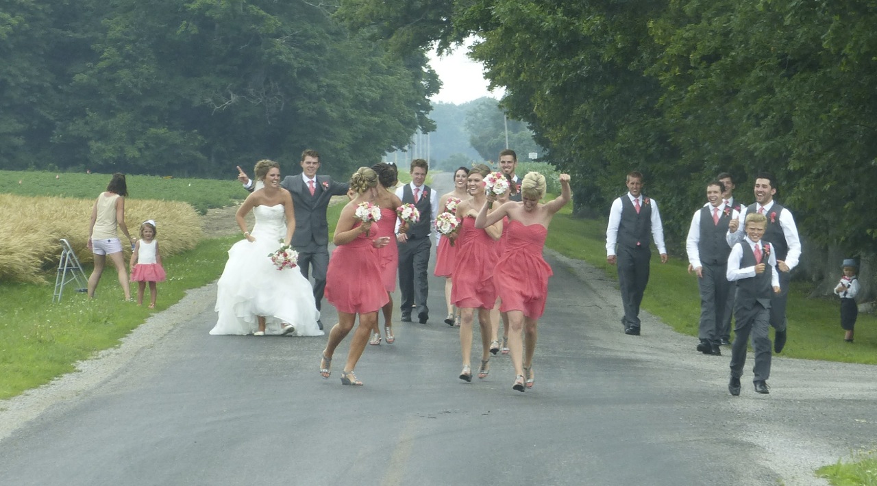 I was driving the ice cream truck to a fireworks show two counties away. While driving through the middle county, the random rural road I chose had many people in formal dress near a field. I noticed the crowd of people when I was about a third of a mile away. As I got closer, I speculated that it might be a wedding party. I grabbed my camera as I approached them and some of them started running toward me. The fun part was that their photographer took advantage of an ice cream truck showing up as a prop. The SUPER cool aspect was that the bride & groom met me four years before that when both of them rode to their prom in the ice cream truck with me. One of their bridesmaids rode to her prom two years in a row in the ice cream truck driven by me. The stories about the prom rides are in Chapter VII of my book: “Lessons from an Ice Cream Truck”